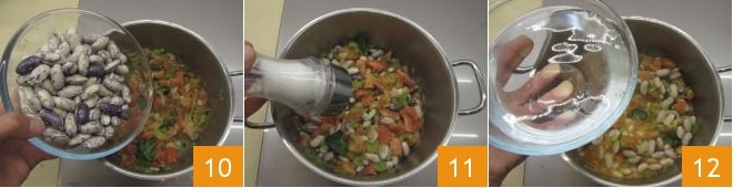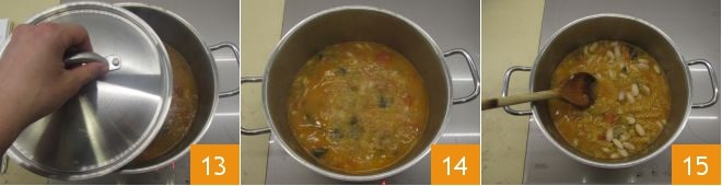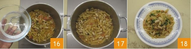 decken Sie den Topf mit einem Deckel ab 13 und kochen Sie auf mittlerer, aber nicht zu hoher Hitze für 20 Minuten, dabei gelegentlich umrühren. Nach dieser Zeit den Deckel abnehmen 14 und weitere 15-20 Minuten kochen oder bis die Bohnen weich sind. An diesem Punkt die Pasta hineingeben und umrühren 15.