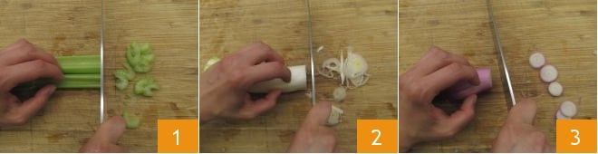 Um die sommerliche Pasta e fagioli zuzubereiten, waschen und putzen Sie zunächst den Sellerie und schneiden ihn in Scheiben 1, dann schälen Sie den Lauch, putzen ihn und schneiden ihn in feine Ringe 2. Putzen Sie die Frühlingszwiebel und schneiden Sie diese ebenfalls auf die gleiche Weise 3.