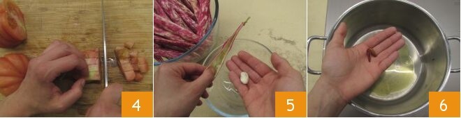Waschen Sie die Tomaten, schneiden Sie sie in Scheiben und dann in Würfel 4. Zum Schluss die frischen Bohnen aus den Schalen lösen 5. Sobald das Gemüse vorbereitet ist, können Sie mit dem Kochen beginnen: Erhitzen Sie das Öl in einem großen Topf, würzen Sie es für einen Moment mit dem Chili 6