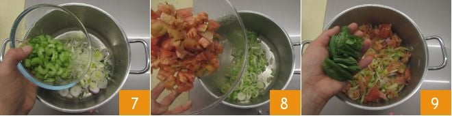 und fügen Sie dann den Sellerie, die Frühlingszwiebel und den Lauch hinzu 7. Braten Sie alles für ein paar Minuten an, dann fügen Sie die in Stücke geschnittenen Tomaten 8 und die Basilikumblätter hinzu 9