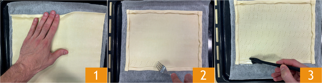 Um die sommerliche salzige Torte zuzubereiten, beginnen Sie damit, den Blätterteig direkt auf das Backblech zu rollen. Falten Sie die Ränder des Teigs etwa einen Zentimeter nach innen 1. Stechen Sie den Boden mit einer Gabel ein 2 und bestreichen Sie ihn mit Milch 3.