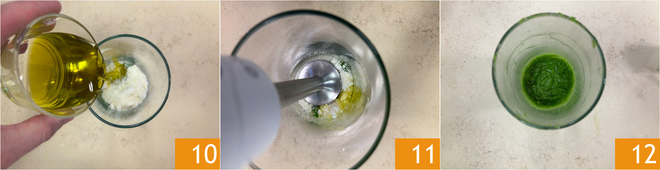 Zuletzt gießen Sie das Öl dazu 10 und mixen Sie in mehreren Schritten (um die Mischung nicht zu erhitzen) 11, bis Sie eine homogene Sauce erhalten 12.