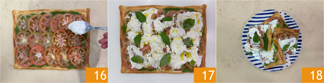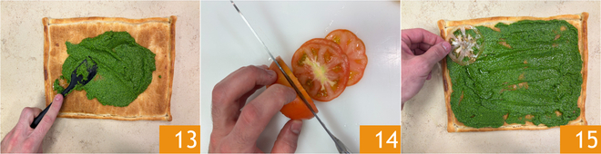 Verteilen Sie das Pesto auf dem gesamten Blätterteigboden 13. Schneiden Sie die Tomate in sehr dünne Scheiben 14 und legen Sie sie leicht überlappend auf die Oberfläche 15.