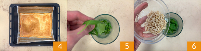 Backen Sie den Boden im vorgeheizten Umluftofen bei 200 °C für etwa 10 Minuten. Wenn er an den Rändern goldbraun ist, nehmen Sie ihn aus dem Ofen und lassen Sie ihn abkühlen 4. In der Zwischenzeit bereiten Sie das Pesto zu: Geben Sie die gewaschenen und getrockneten Basilikumblätter 5 und die Pinienkerne 6 in den Mixerbehälter.