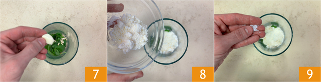 Fügen Sie auch den entkernten Knoblauch 7, den geriebenen Pecorino und Parmesan 8 und das grobe Salz 9 hinzu.