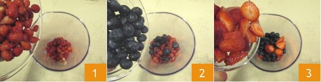 Um das Sorbet aus roten Früchten zuzubereiten, gebt in eine Schüssel die Himbeeren, die Walderdbeeren 1, dann die Blaubeeren 2 und die Erdbeeren 3.