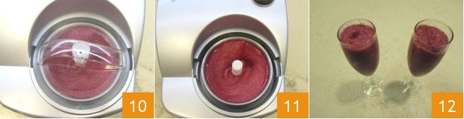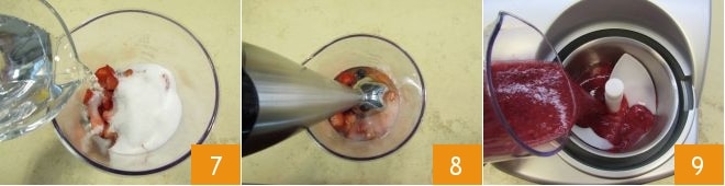 Gebt auch das Wasser hinzu 7, danach püriert alles, bis ihr eine homogene Mischung erhaltet. Gebt die Mischung in eine Eismaschine 9,