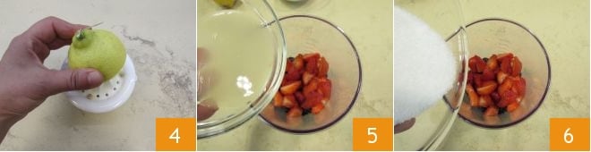 Presst eine Zitrone aus 4, dann siebt den Saft gut mit einem Sieb, um alle Kerne zu entfernen. Gießt den Zitronensaft in die Schüssel mit den Früchten 5, fügt dann den Zucker hinzu 6.