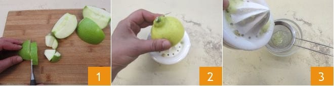 Um das grüne Apfel Sorbet zuzubereiten, waschen Sie zuerst einen grünen Apfel und schneiden Sie ihn in Stücke, ohne die Schale zu entfernen 1. Pressen Sie eine Zitrone aus 2, filtern Sie dann den gewonnenen Saft 3, um die Kerne zurückzuhalten.