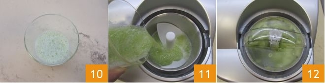 Sobald die Zutaten gemixt sind 10, geben Sie die Mischung in die Eismaschine 11 und schalten Sie sie für etwa 25 Minuten ein 12. Wenn Sie keine Eismaschine haben, können Sie folgendermaßen vorgehen: Geben Sie die Mischung in eine weite Schüssel und stellen Sie sie mindestens eine Stunde in den Gefrierschrank. Dann nehmen Sie sie heraus, rühren Sie sie mit einer Gabel um und wiederholen Sie den Vorgang etwa alle halbe Stunde, bis Sie die gewünschte Konsistenz erreicht haben.