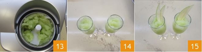Nach der angegebenen Zeit stoppen Sie die Eismaschine und füllen Sie Ihr Sorbet in Gläser 14, die Sie mit zwei dünnen Apfelscheiben garnieren können. Ihr grünes Apfel Sorbet ist bereit, genossen zu werden 15!
