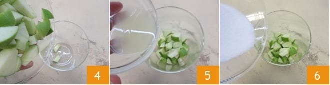 Geben Sie dann die Apfelstücke in eine Schüssel 4, fügen Sie den Zitronensaft 5 und den Zucker hinzu 6,