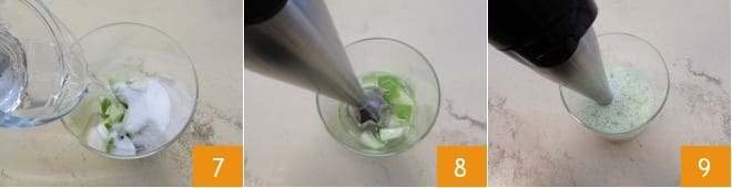 und geben Sie dann das Wasser hinzu 7 und mixen Sie alles 8, bis Sie eine cremige Konsistenz erhalten 9.