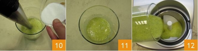 Fügen Sie den Zucker hinzu 10 und mixen Sie weiter, bis Sie eine cremige Konsistenz erreichen 11. Geben Sie die Mischung in die Eismaschine 12