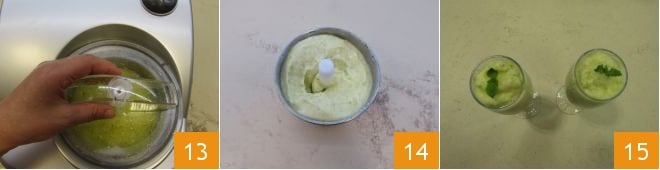 und lassen Sie sie 30 Minuten laufen 13. Wenn Sie keine Eismaschine haben, können Sie folgendermaßen vorgehen: Geben Sie die Mischung in eine breite Schüssel und stellen Sie sie für mindestens eine Stunde in den Gefrierschrank. Nehmen Sie sie dann heraus, rühren Sie sie mit einer Gabel um und wiederholen Sie den Vorgang jede halbe Stunde, bis Sie die gewünschte Konsistenz erreichen. Bei diesem Sorbet, das mit der Eismaschine hergestellt wird, hat es nach 30 Minuten die richtige Konsistenz erreicht 14, servieren Sie es und garnieren Sie es mit Minzblättern! 15