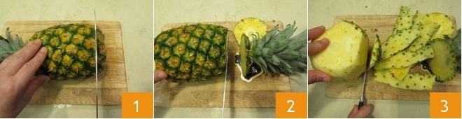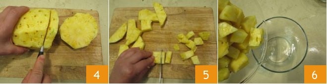 Schneiden Sie die Ananas ohne Schale in Scheiben 4 und dann in kleine Stücke 5. Geben Sie die Ananas in eine Schüssel,