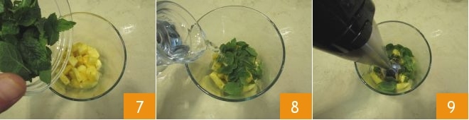 fügen Sie dann die Minzblätter hinzu 7, gießen Sie das Wasser ein 8 und beginnen Sie zu mixen 9.