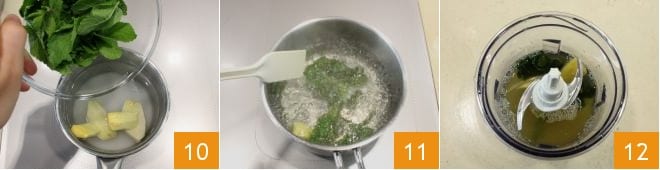 Gehen Sie zum Minze-Ingwer-Sorbet über: Geben Sie das Wasser mit dem Zucker, dem geschälten und in Stücke geschnittenen Ingwer und den Minzblättern in einen kleinen Topf 10. Bringen Sie es etwa 2 Minuten lang zum Kochen 11, dann schalten Sie das Feuer aus und lassen es schnell abkühlen, indem Sie den Topf möglicherweise in eine Schüssel mit Eis stellen. Pürieren Sie alles 12