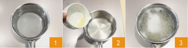 Um das Mango-Limetten- und Minze-Ingwer-Sorbet zuzubereiten, beginnen Sie mit dem Mango-Sorbet: Geben Sie das Wasser und den Zucker in einen kleinen Topf 1, fügen Sie den Limettensaft hinzu 2 und bringen Sie alles für etwa 2 Minuten zum Kochen 3. Lassen Sie es schnell abkühlen, indem Sie den Topf möglicherweise in eine Schüssel mit Eis tauchen.