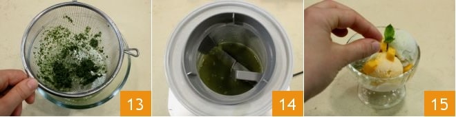 und passieren Sie es durch ein Sieb 13, dann gießen Sie es in die Eismaschine 14: Schalten Sie die Eismaschine ein, es dauert mindestens 40 Minuten, bis das Sorbet die gewünschte Konsistenz erreicht. Sobald es fertig ist, können Sie es in eine Schüssel gießen und mit Frischhaltefolie abdecken, um es bis zum Gebrauch im Gefrierschrank aufzubewahren. (Wenn Sie keine Eismaschine besitzen, können Sie die Mischungen in eine breite Schüssel gießen und mindestens 1 Stunde im Gefrierschrank aufbewahren. Dann herausnehmen, mit einer Gabel auflockern und den Vorgang wiederholen, bis die gewünschte Konsistenz erreicht ist). Servieren Sie das Mango-Limetten- und Minze-Ingwer-Sorbet in hübschen Schälchen, garniert mit Mango-Stücken und Minzblättern 15!