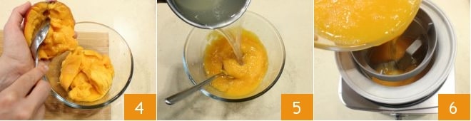 In einer kleinen Schüssel sammeln Sie das mit Hilfe eines Löffels ausgeschabte Mangofleisch 4, pürieren es und fügen es dem Limettensirup hinzu 5, mischen Sie und gießen die Mischung in eine Eismaschine (Sie sollten darauf geachtet haben, die Schüssel über Nacht im Kühlschrank aufzubewahren) 6.