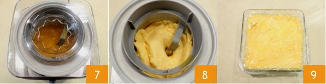 Schalten Sie die Eismaschine ein, das Sorbet beginnt zu verdicken 7, es dauert etwa 40 Minuten, bis es eine cremige, aber feste Konsistenz erreicht 8. Übertragen Sie das Sorbet anschließend in eine Schüssel, decken Sie es mit Frischhaltefolie ab 9 und lagern Sie es im Gefrierschrank, während Sie mit der Zubereitung fortfahren.