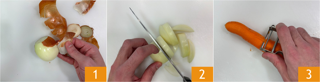 Um die Soße für Braten zuzubereiten, bereiten Sie zuerst die Fleischbrühe zu und halten Sie sie warm. Schälen Sie die Zwiebeln 1 und schneiden Sie sie in Spalten 2. Schälen Sie die Karotten 3.
