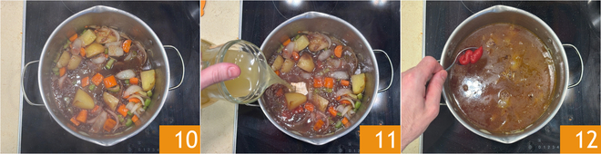 Lassen Sie alles vollständig verdampfen 10, dann fügen Sie die Fleischbrühe 11 und das Tomatenmark 12 hinzu.