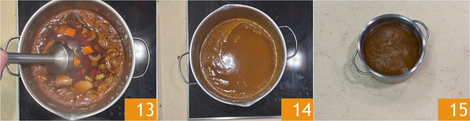 Kochen Sie bei niedriger Hitze für eine Stunde. Da wir leicht gesalzene Brühe verwendet haben, haben wir es vorgezogen, kein Salz hinzuzufügen. Sobald die Soße fertig ist, pürieren Sie alles mit einem Stabmixer 13 bis eine seidig-cremige Masse entsteht; lassen Sie die Soße noch 10 Minuten bei niedriger Hitze eindicken und rühren Sie gelegentlich um 14. Fügen Sie falls nötig Salz hinzu. Ihre Soße für Braten ist servierfertig 15!