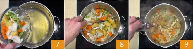 Erhitzen Sie in einem Topf etwas Öl und fügen Sie das Gemüse hinzu 7. Rühren Sie um 8 und lassen Sie alles bei mittlerer Hitze für etwa 5 Minuten anbraten. Löschen Sie mit Rotwein ab 9.