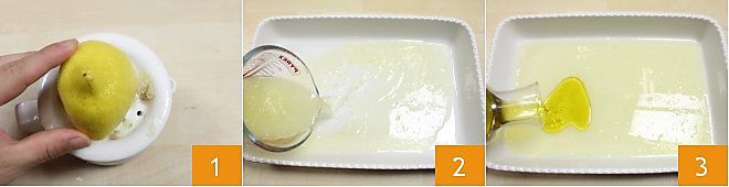 Um das Schweine-Souvlaki zuzubereiten, beginnen Sie mit der Marinade, die zum Aromatisieren des Fleisches dient: Pressen Sie den Saft der Zitronen aus 1, geben Sie den Zitronensaft 2 in eine rechteckige Auflaufform von etwa 23x35 cm, das Öl 3,