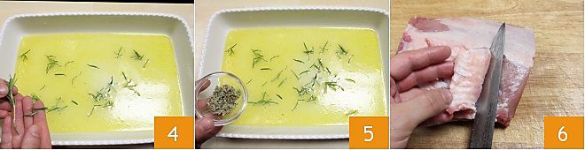 den Rosmarin 4, den Oregano 5, würzen Sie schließlich mit Salz und Pfeffer. Kümmern Sie sich nun um das Fleisch. Nehmen Sie das Schweinefilet, entfernen Sie den Fettanteil mit einem scharfen Messer 6,