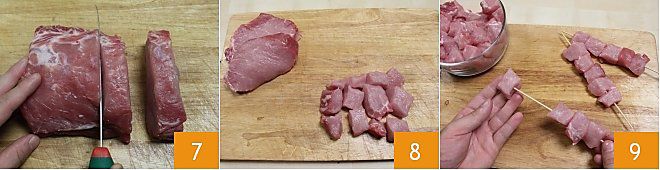 schneiden Sie etwa zwei Zentimeter dicke Scheiben 7 und schneiden Sie daraus Würfel von etwa 2 cm x 2 cm 8, jedes Stück sollte etwa 15 g wiegen. Stecken Sie die Fleischwürfel auf Holzspieße mit einer Länge von 20 cm 9. Jeder Spieß kann 5 Fleischstücke enthalten, mit diesen Mengen erhalten Sie 12 Spieße.
