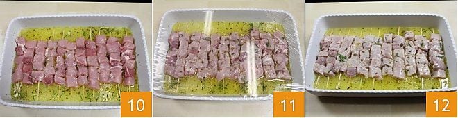 Legen Sie die Schweine-Souvlaki in die zuvor vorbereitete Emulsion 10, decken Sie die Auflaufform mit Frischhaltefolie ab 11 und stellen Sie sie für mindestens 30 Minuten zum Marinieren in den Kühlschrank. Nach der erforderlichen Zeit nehmen Sie die Auflaufform aus dem Kühlschrank 12