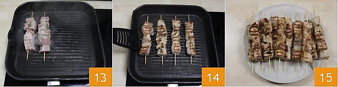 und fahren Sie mit dem Kochen fort: Stellen Sie einen gusseisernen Grill auf den Herd und erhitzen Sie ihn gut, grillen Sie die Spieße und achten Sie darauf, sie auf jeder Seite zu garen 13. Das Fleisch innen sollte zart, aber gut durchgegart sein und außen sollten die typischen Grillstreifen entstehen 14, es dauert etwa 15 Minuten. Servieren Sie die Schweine-Souvlaki 15 noch heiß und begleiten Sie sie mit Tzatziki und dem typischen griechischen Salat.