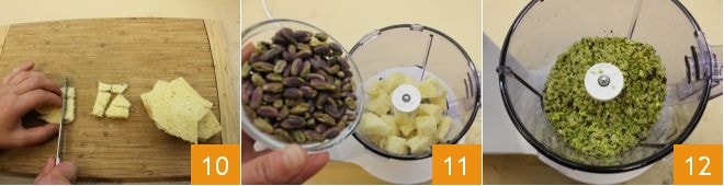 Wenn noch etwa zehn Minuten verbleiben, beginnen Sie mit der Zubereitung der Panade. Schneiden Sie die Brotkrume in Würfel 10 und geben Sie sie zusammen mit den Pistazien in einen Mixer 11. Fügen Sie die geriebene Limettenschale, Thymian, Majoran hinzu und mixen Sie alles zusammen 12.