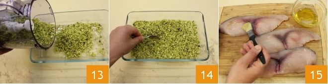 Geben Sie die Panade in eine große Auflaufform 13, fügen Sie Salz, Pfeffer hinzu und mischen Sie mit einem Löffel 14. Nehmen Sie die Schwertfischscheiben und bestreichen Sie sie auf beiden Seiten mit Öl 15.