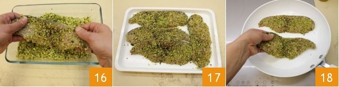 Dann jede Scheibe in die Panade drücken, leicht andrücken, damit sie gut haftet 16. Wiederholen Sie den Vorgang für alle Filets 17, währenddessen erhitzen Sie eine Pfanne mit einem Schuss Öl. Dann den Schwertfisch darauflegen 18.
