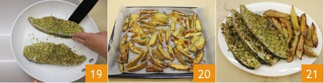 Braten Sie die Schwertfischscheiben ein paar Minuten auf jeder Seite 19, nehmen Sie die inzwischen knusprigen Kartoffeln aus dem Ofen 20 und servieren Sie die Schwertfischfilets in Pistazienkruste mit heißen Kartoffelspalten 21!