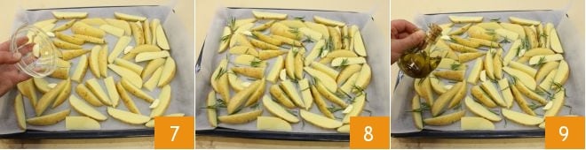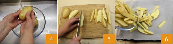 In der Zwischenzeit widmen Sie sich der Zubereitung der Kartoffeln. Waschen Sie sie gründlich unter fließendem Wasser mit der Schale, um jeglichen Schmutz zu entfernen 4. Dann in Spalten schneiden 5 und auf einem mit Backpapier ausgelegten Backblech verteilen, gut voneinander getrennt 6.