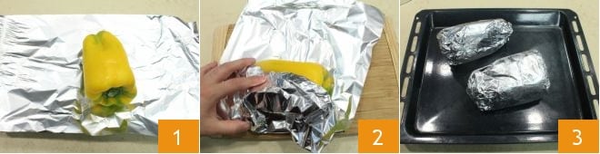 Um die Spaghetti mit Paprika, Oliven und Anchovis zuzubereiten, waschen Sie die Paprika und wickeln Sie sie in Alufolie ein (1-2). Legen Sie sie auf ein Backblech 3 und garen Sie sie im vorgeheizten statischen Ofen 40 Minuten lang bei 220°C (oder im Umluftofen 30 Minuten bei 200°C).