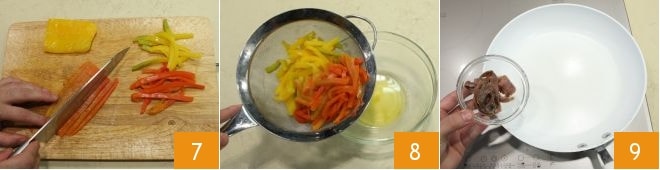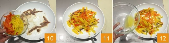 Fügen Sie die Paprikastreifen hinzu (10-11), braten Sie sie ein paar Minuten an und geben Sie das Kochwasser der Paprika hinzu 12.