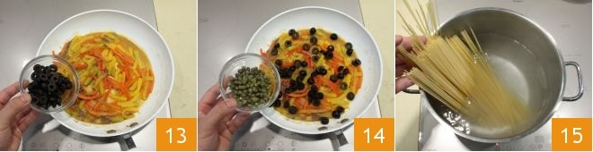 Fügen Sie auch die Oliven 13 und die Kapern 14 hinzu. In der Zwischenzeit einen großen Topf mit reichlich Salzwasser zum Kochen bringen, die Spaghetti hinzugeben 15 und etwa 10 Minuten oder nach Packungsanweisung kochen.