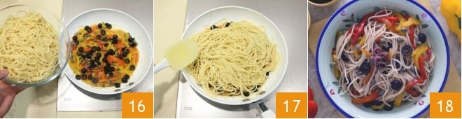 Nach dem Garen die Spaghetti abgießen und zur Sauce geben 16, umrühren, um die Pasta zu würzen 17. Die Spaghetti mit Paprika, Oliven, Kapern und Anchovis sind fertig. Servieren Sie sie sofort heiß 18!