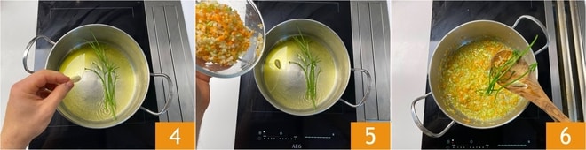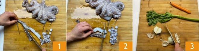 Um die Spaghetti alla Chitarra mit Oktopus-Ragout zuzubereiten, stellen Sie zunächst sicher, dass der Oktopus gut gesäubert ist, ohne Augen und Schnabel. Schneiden Sie nun die Tentakel ab und halbieren Sie sie 1, dann schneiden Sie sie so, dass Sie Stücke von etwa einem halben Zentimeter erhalten 2. Bereiten Sie das Gemüse für das Sofrito vor und hacken Sie Karotte, Sellerie und Zwiebel fein 3.
