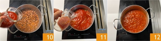 Sobald der Alkohol verdampft ist, fügen Sie auch das Tomatenpüree hinzu 10. Spülen Sie dann den Krug mit Wasser aus und gießen Sie es in den Topf 11. Fügen Sie nur eine Prise Salz hinzu und kochen Sie 40 Minuten, bis der Oktopus zart ist. Gegebenenfalls können Sie Wasser hinzufügen, wenn die Sauce zu dick wird, und die Kochzeit verlängern.