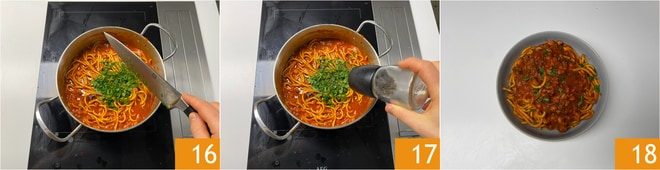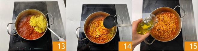 Kochen Sie die Spaghetti alla Chitarra in reichlich gesalzenem kochendem Wasser, abgießen und in die Sauce geben 13. Fügen Sie etwas Kochwasser 14 und einen Schuss Öl hinzu 15.