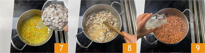Fügen Sie dann die Oktopuswürfel hinzu 7 und mischen Sie. Kochen Sie einige Minuten 8 und sobald das Wasser verdampft ist, mit dem Weißwein ablöschen 9.