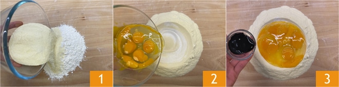 Um die Spaghetti alla chitarra mit Sepia-Tinte, Muscheln und Garnelen zuzubereiten, kümmern Sie sich zuerst um die frische Pasta: Mischen Sie auf einer Arbeitsfläche Mehl 00 und Hartweizengrieß 1. Formen Sie einen klassischen Brunnen und geben Sie in die Mitte die Eier und das Eigelb 2. Fügen Sie eine Prise Salz und die Sepia-Tinte hinzu 3.