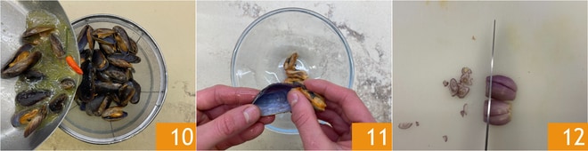 Sobald sie sich geöffnet haben, filtern Sie 10 und bewahren Sie die Kochflüssigkeit auf. Entfernen Sie die Schalen und legen Sie sie beiseite 11. Schälen Sie die Schalotte und schneiden Sie sie fein 12.